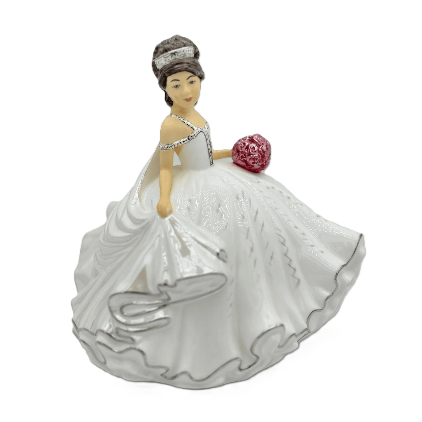 The Mini Bride of the Year figurine by English Ladies Co. beautifully captures the elegance and joy of a bride on her wedding day. This brunette version features intricate detailing in her flowing gown, graceful veil, and hand-painted features, embodying the timeless beauty and excitement of a wedding celebration.