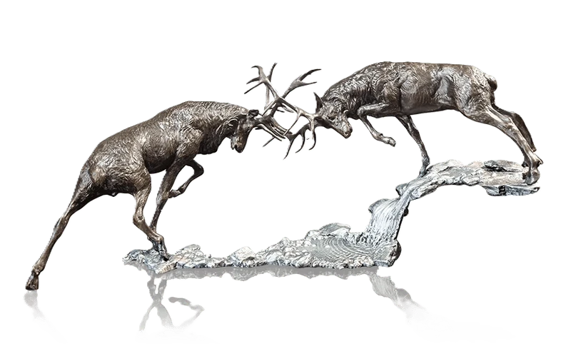 Crafted using the lost wax casting technique, the figurine is made from solid bronze, showcasing intricate details such as the finely sculpted antlers and muscular bodies of the stags. The intense expressions and dynamic postures of the stags bring this moment of wild drama to life, while a rich patina finish adds depth and realism to the piece.