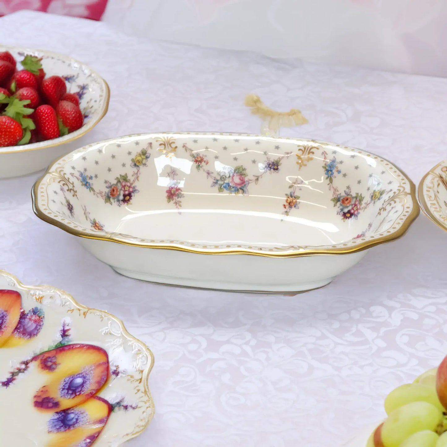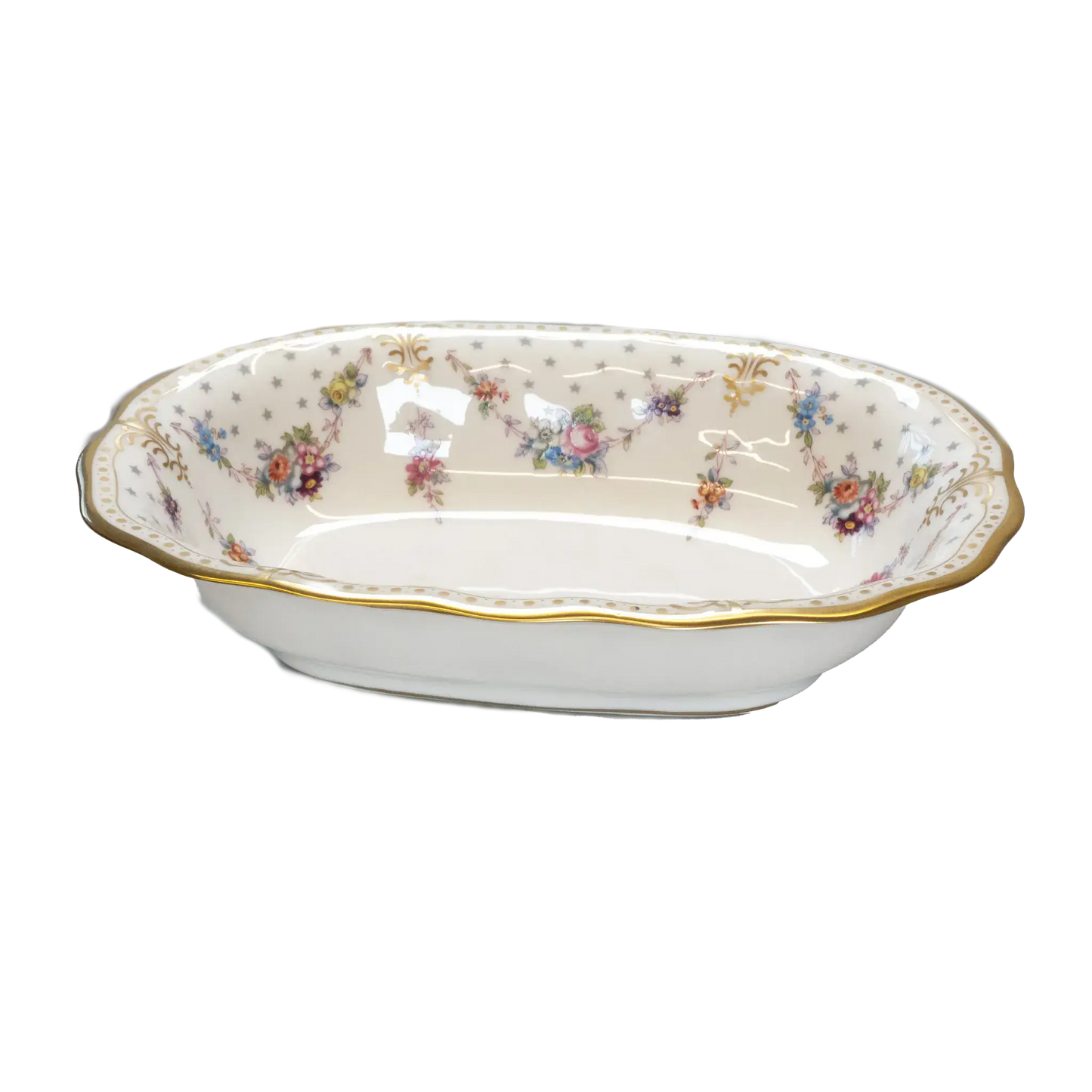 Crafted from fine porcelain and hand-finished with gleaming 22 carat gold, the dish adds a regal touch to any table. Its refined Royal Antoinette design is both dramatic and sophisticated, bringing a sense of luxury to your meals.